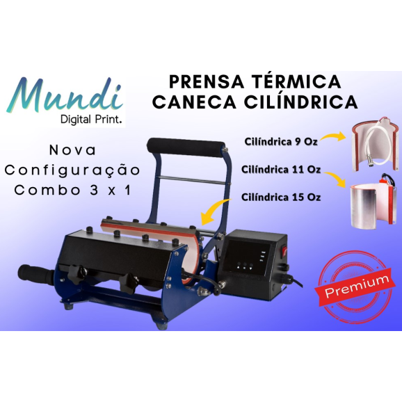 A Prensa de Caneca Mundi 3x1 - é um equipamento que permite estampar canecas cilíndricas de diferentes tamanhos e formatos, devido a ter 3 resistências .