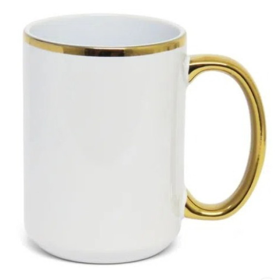 Caneca branca de ceramica 440 ml com a borda e a alça dourada
