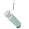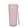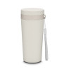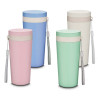 Copo plástico com parede dupla, produzido com fibra de trigo e plástico, com capacidade de 300ml, alça para transporte e tampa rosqueável.