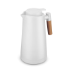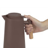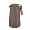Alça de madeira e tampa rosqueável com anel de silicone para vedação.
